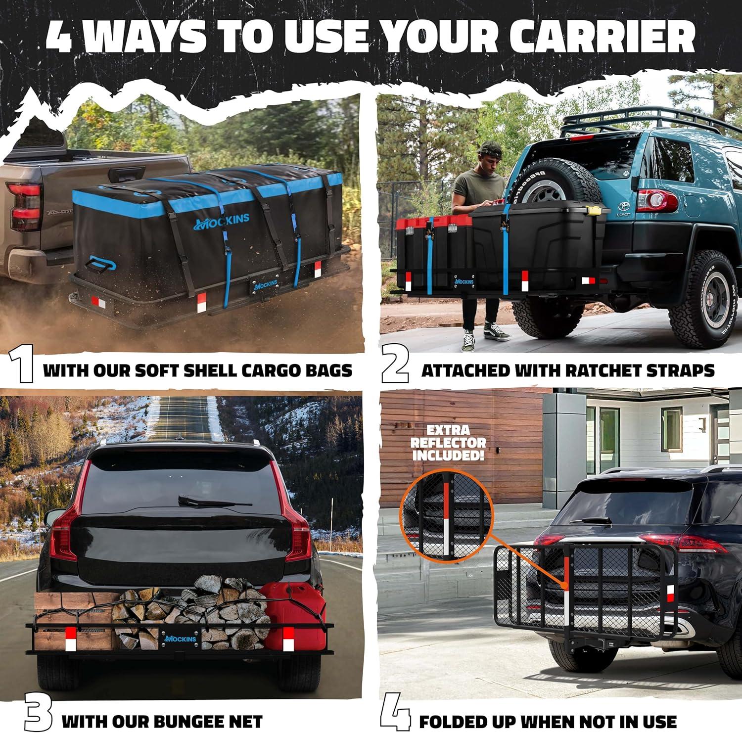 Upgrade Your Road Trip Essentials: No cargo hitch carrier setup is complete without a set of all-purpose trailer hitch storage bag packing cubes. Add them to any of the Mockins Hitch Mount Cargo Carrier sets & experience a new way to pack & hit the road.