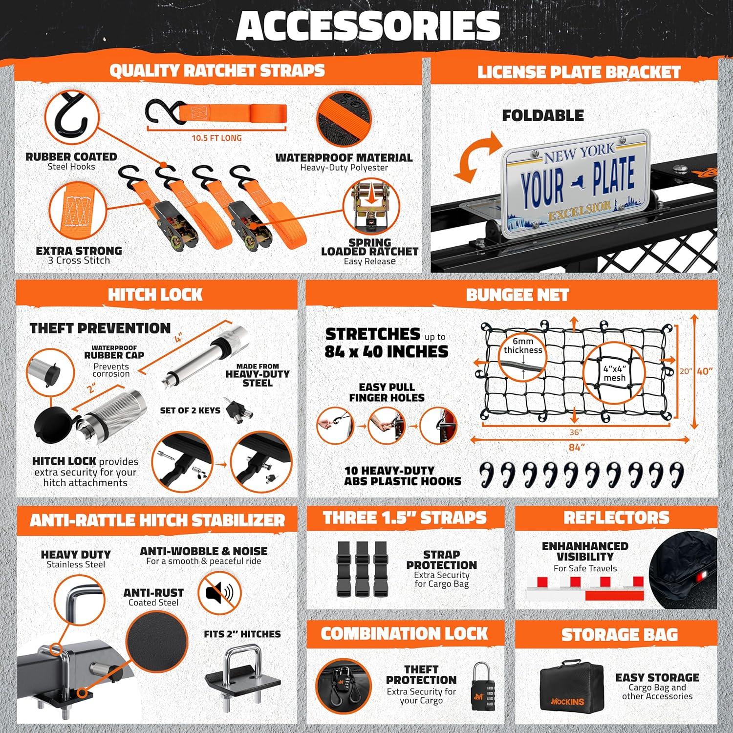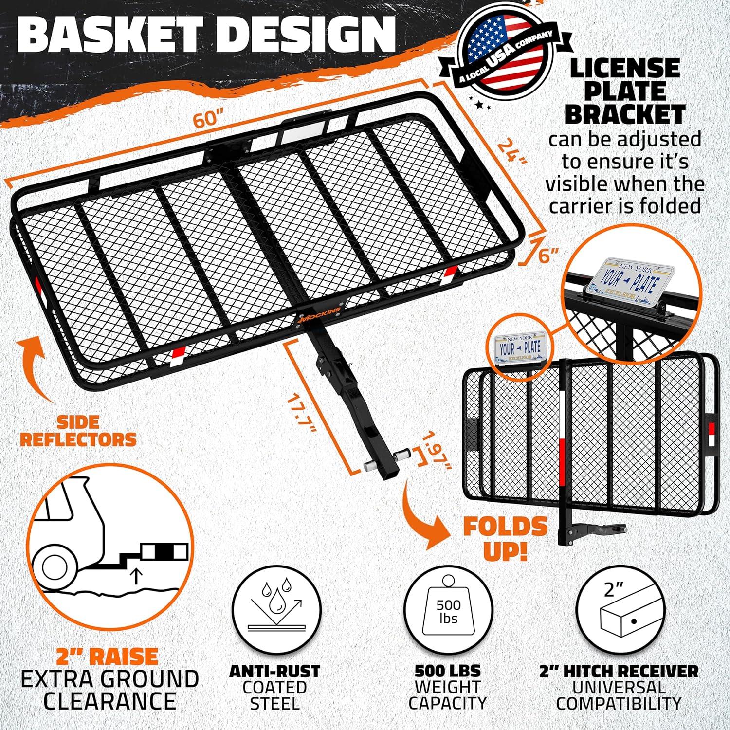 WEATHER-READY CAR ROOF CARGO CARRIER : Enhance both style & performance with this metallic black car top carrier basket, built to hold up to 250 lbs. Our roof top cargo carriers easily mount to any crossbar-equipped vehicle. The weatherproof, rust-resistant steel frame of the roof basket provides lasting durability, while its aerodynamic build reduces wind drag, noise & fuel use. The Mockins Roof Rack Cargo Basket offers one of the most efficient car topper luggage carrier waterproof solutions.