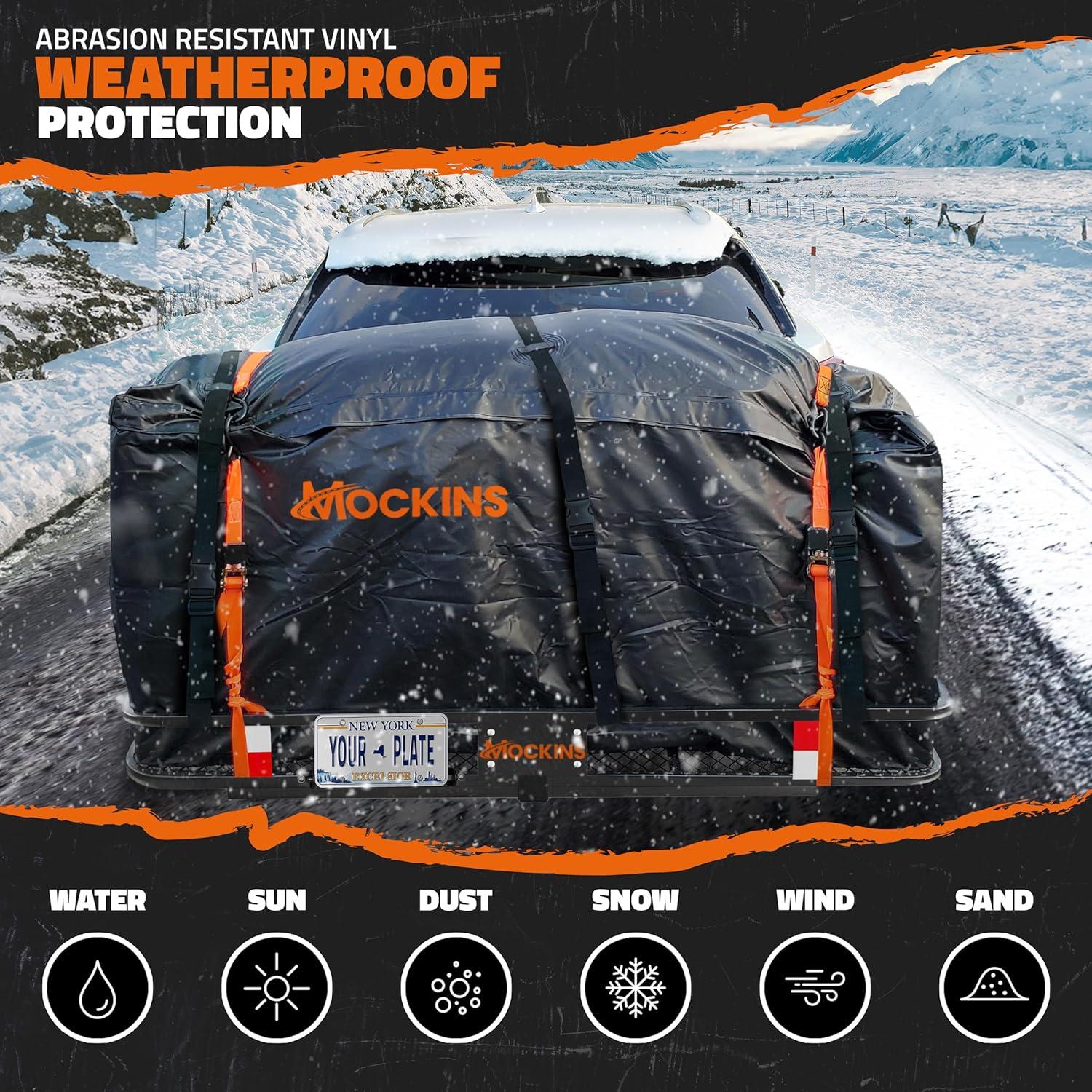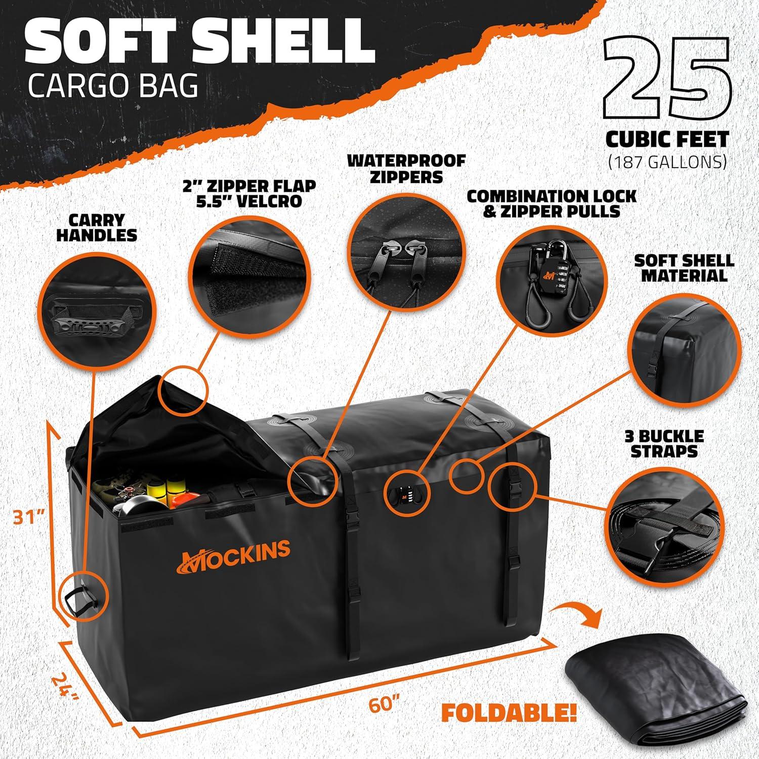 INCLUDES ROOFTOP CARGO BAG : The Mockins 16 Cu Ft. (45″x34″x18″) Waterproof Cargo Bag for top of car is made from durable, abrasion-resistant vinyl, providing all-weather performance. Our vehicle soft shell carriers feature a protective zipper flap with Velcro closures to keep cargo secure. Along with its spacious, foldable design, the car roof bag includes 4 side handles & easy-to-use zipper pulls. Cargo always stays protected with this cartop carrier waterproof bag, ideal for every journey.