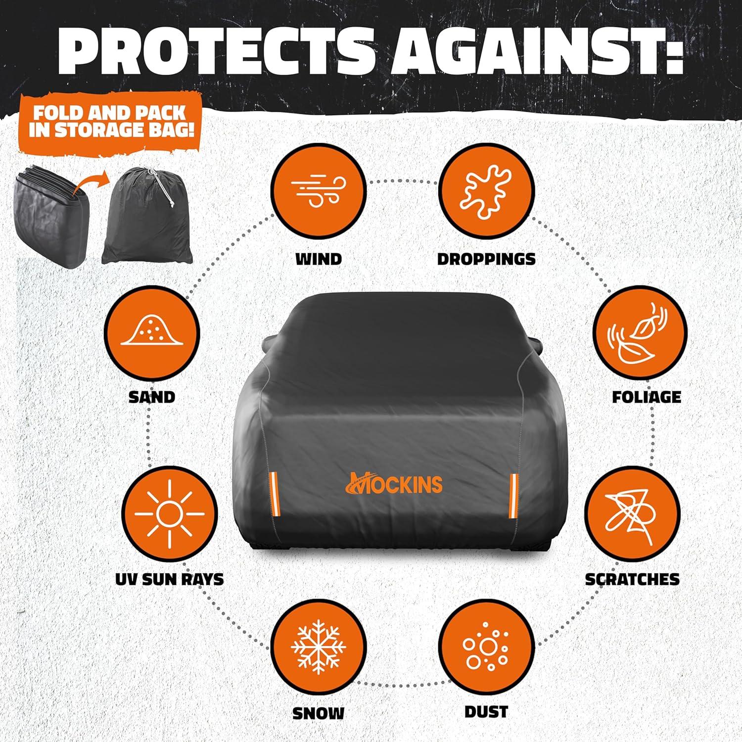 STORM-READY, ANTI-THEFT COVER FOR MOTORCYCLE : This motorcycle covers waterproof outdoor storage set features a windproof sewn-on buckle strap, elastic hem, reflectors for nighttime visibility & a reinforced lock hole fitting chains, cables or U/D-locks for theft prevention. Use it as a hefty motorcycle tarp for windy weather, or as a motorcycle cover indoor tarp for storage season. From a tough winter motorcycle cover to a basic motorcycle dust cover , you get year-round defense with Mockins.
